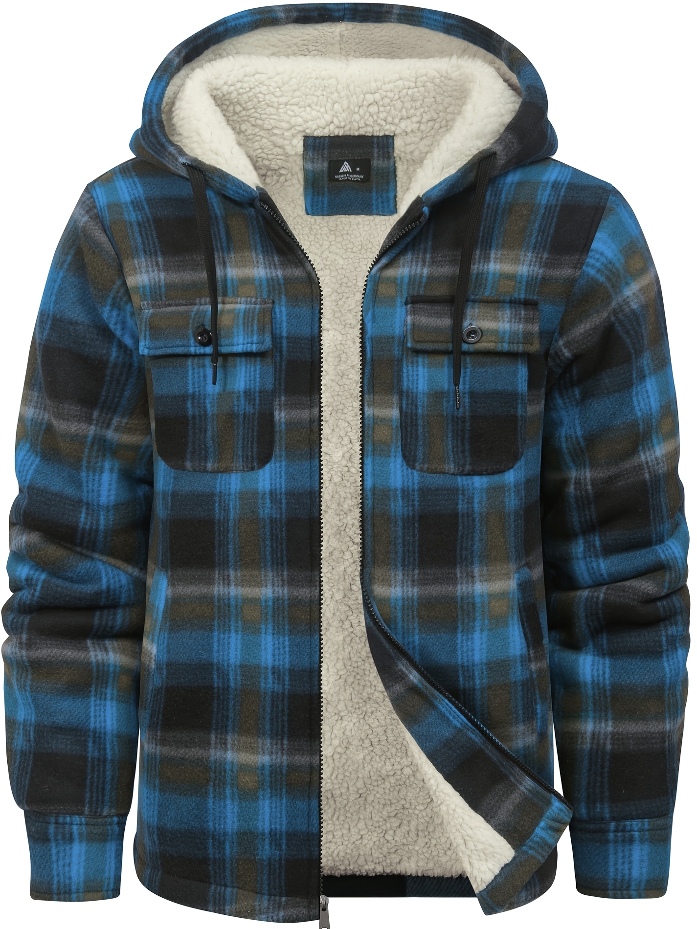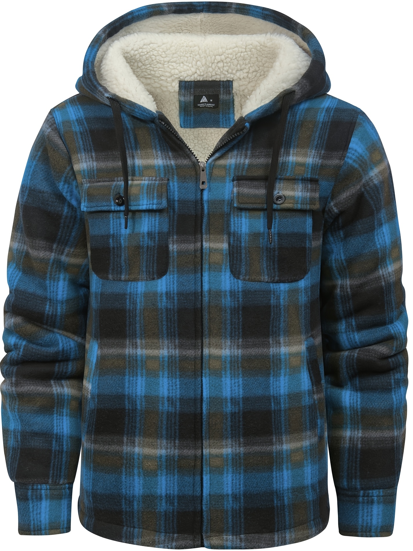 Men's Sherpa-Lined Full-Zip Hooded Jacket - Plaid Flannel Winter Coat with Turquoise/Black/White/Gray Plaid, Machine Washable, Full-Zip Front & Pockets - Casual Outdoor & Everyday Cold Weather Outerwear (Regular Fit)