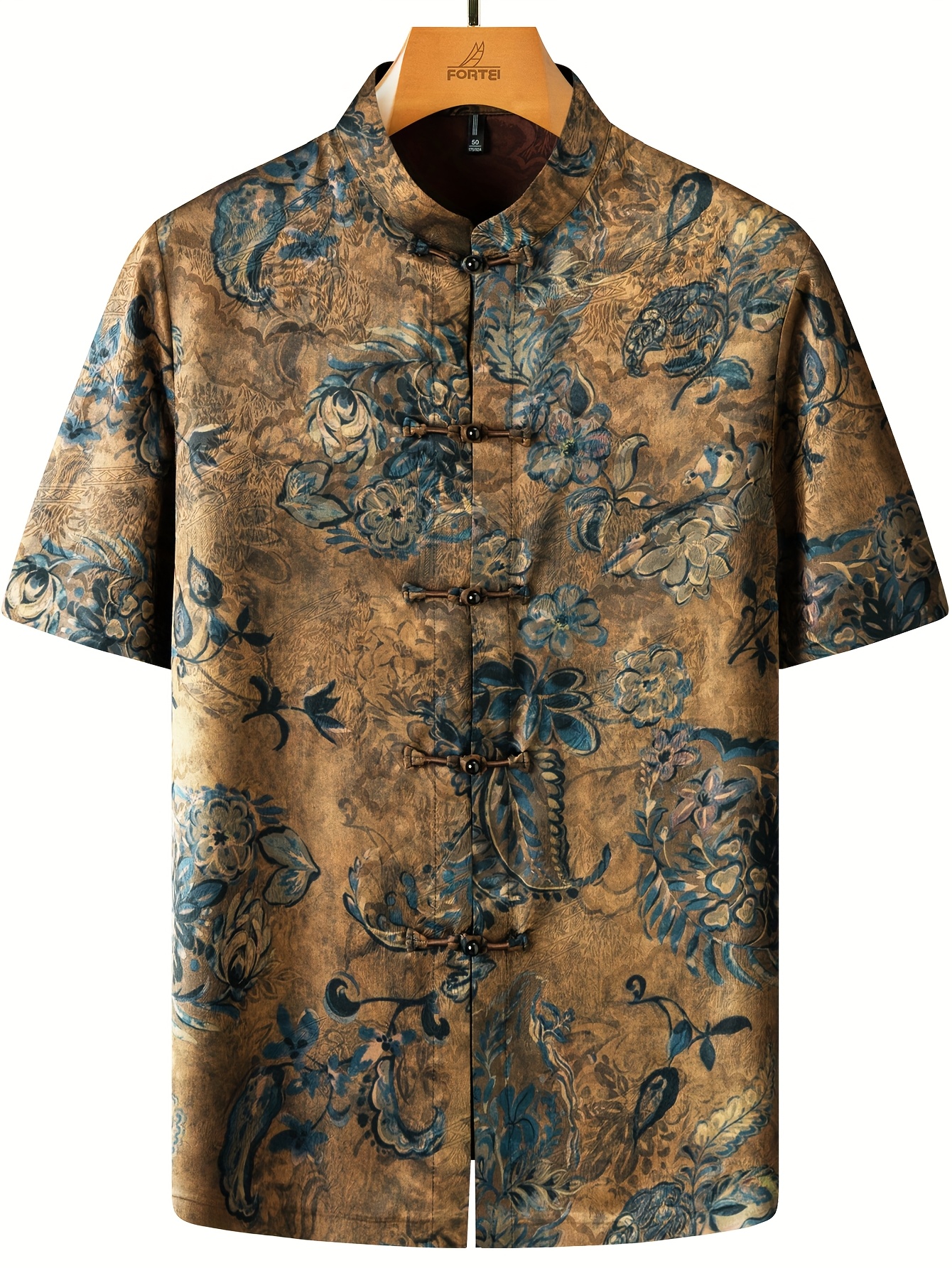FORTEI Men's Traditional Chinese Tang Suit Short Sleeve Shirt - Lightweight, Light Beige-Friendly Polyester Blend with Intricate Floral Print, Button-Up Collar Design for Casual Summer Wear