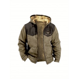 Men's Retro Full-Zip Hooded Sweatshirt - Fleece-Lined Winter Jacket with Contrast Color Block Design, Vintage Print & Machine Washable Polyester for Casual Outdoor Wear, Sweater Hoodie, Cold Weather Apparel, Classic Zipup Style, Fleecelined Comfort