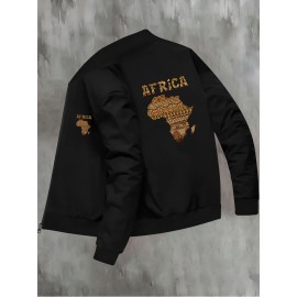 Men's Stylish African Print Zip-Up Jacket - Slim Fit, Beige with "AFRICA" Map Design & Tribal Patterns, Casual Outdoor Coat for Fall/Winter