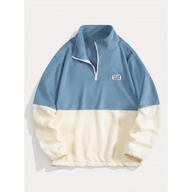 Men'S Casual Geometric Color Block Fleece Sweatshirt Jacket, Polyester Knit Fabric, Regular Fit, with High Neck and Medium Stretch, for All-Season Pullover