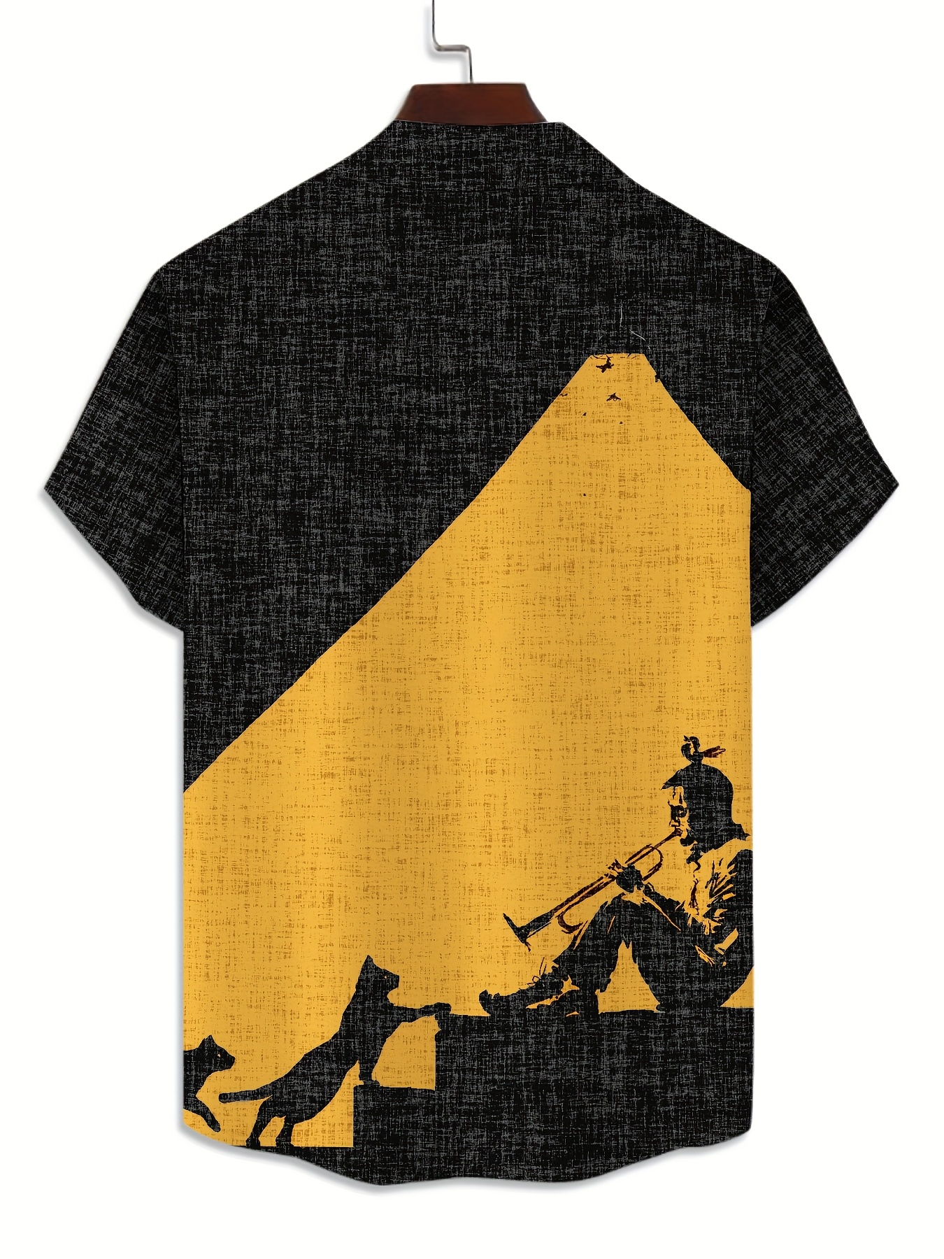 Men's Lightweight Shirt - Black & Mustard-Yellow Geometric Cat Art Print Button-Up - Stand-Up Collar Casual Beach Vacation Outfit - Machine Washable Summer Blouse for Everyday & Formal Events, Beach Clothes, Nontransparent Fabric